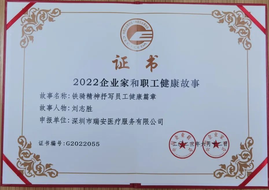 为深入贯彻落实党的二十大精神,落实国务院办公厅《“十四五”国民健康规划》“推进健康企业建设,培育一批健康企业特色样板”的工作要求,交流健康企业建设经验与成果,进一步推动健康企业建设和健康产业发展。中国企业联合会中国企业联合会组织开展了“2022全国健康企业建设特色案例及企业家和职工健康故事征集”活动。会议当天,瑞安医疗的“铁骑精神抒写员工健康篇章”成功入选了2022全国健康企业家故事。
